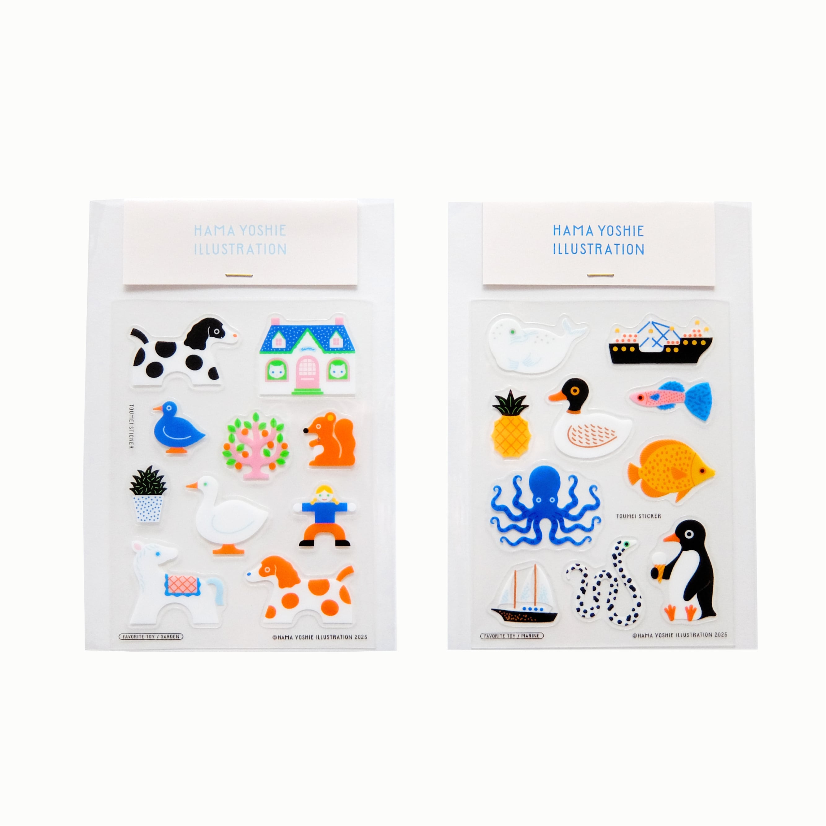 透明のマルチステッカーです。それぞれ10点ずつのステッカーシートになっていて、しっかりと厚みのある素材に印刷しています。下地に白インクを刷っているので暗い色のものにも貼ることができます。